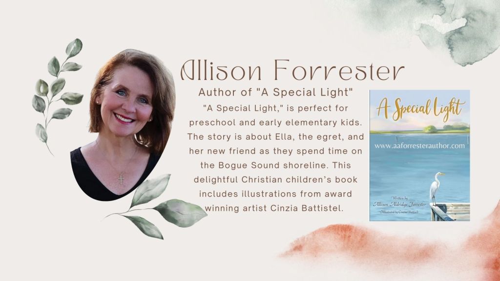 Allison Forrester, author of “A Special Light,” is perfect for preschool and early elementary kids. The story is about Ella, the egret, and her new friend as they spend time on the Bogue Sound shoreline. This delightful Christian children’s book includes illustrations from award winning artist Cinzia Battistel.